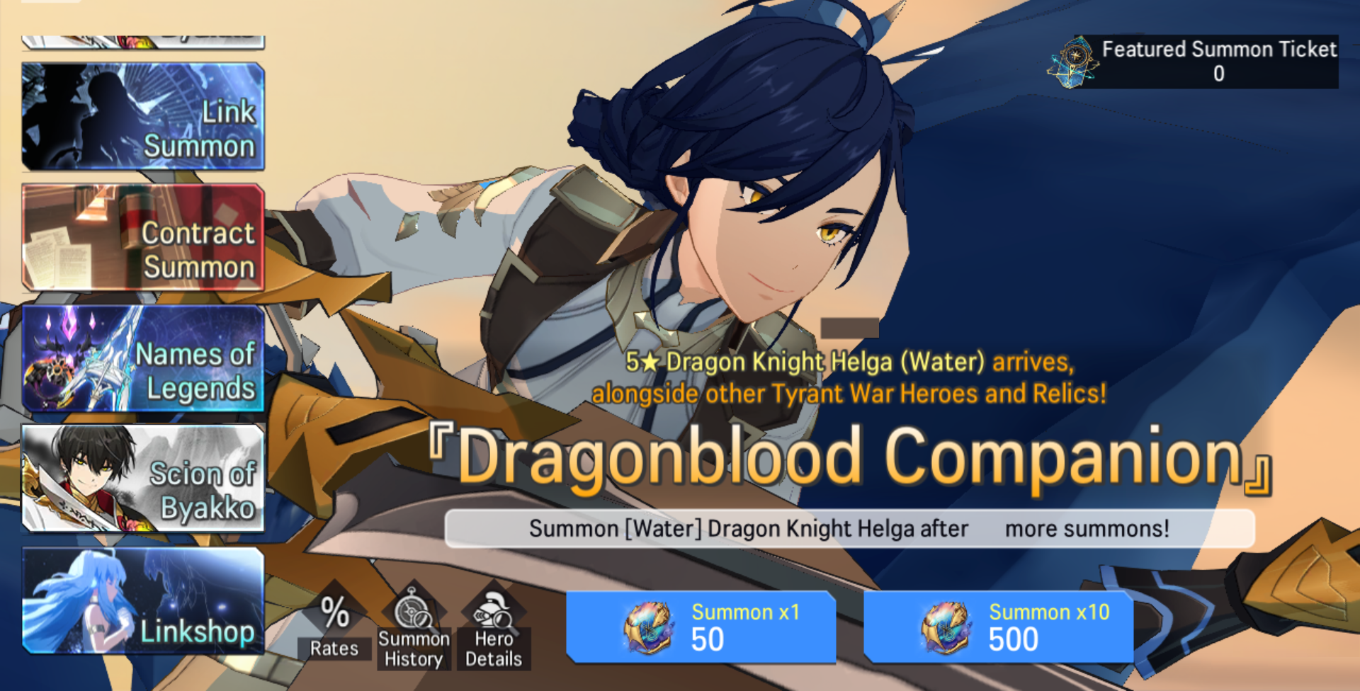 ※ If the player has not recruited 5★ Dragon Knight Helga (Water) within 89 summons, the player is guaranteed to recruit 5★ Dragon Knight Helga (Water) on their 90th summon.