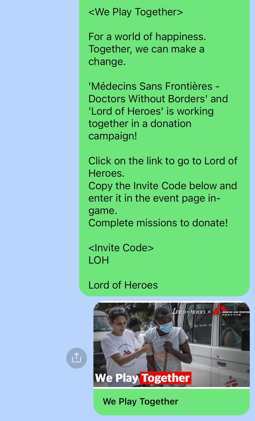 - Tap on the 'Invite' button to copy the Invite Code. The download link for the Lord of Heroes app will also be copied.