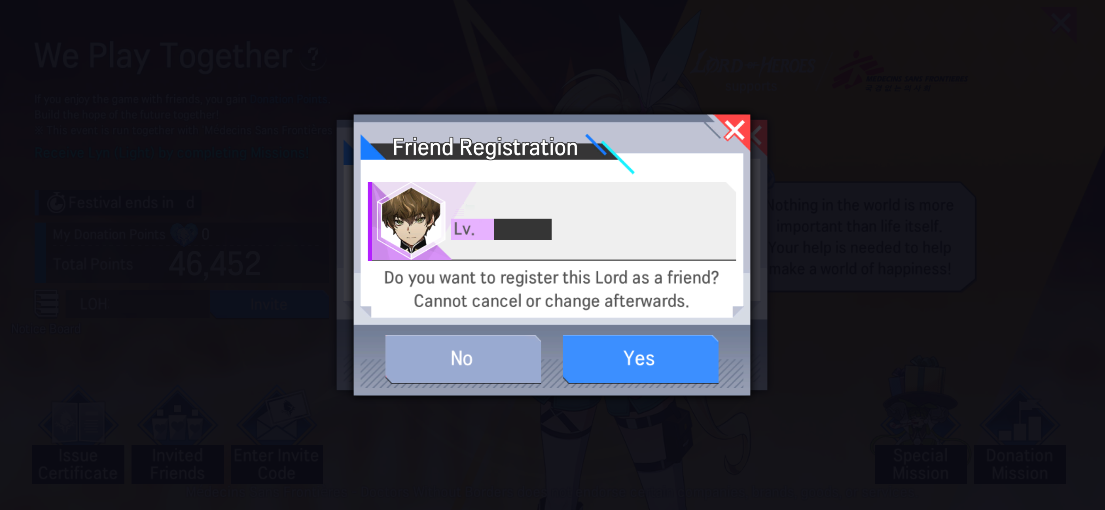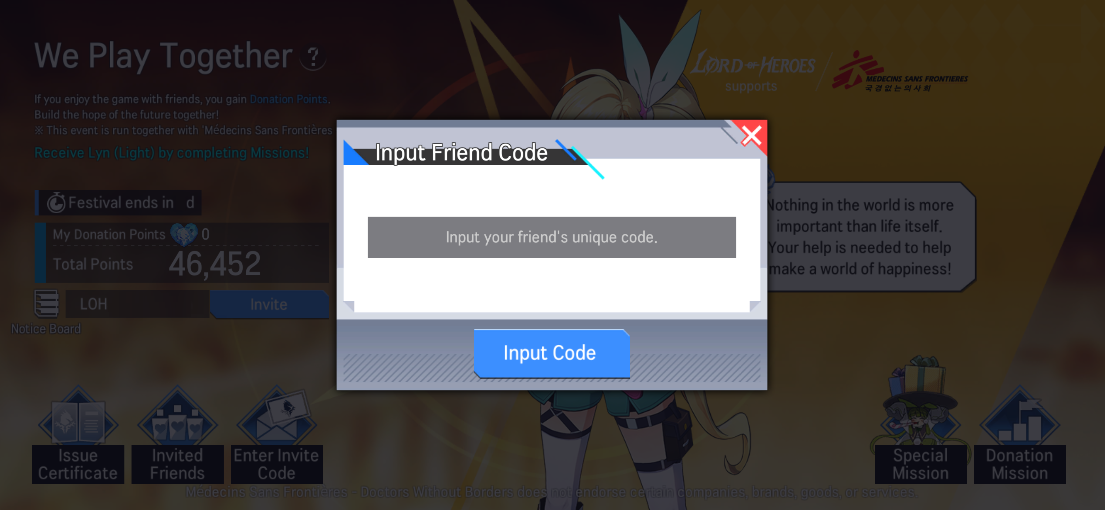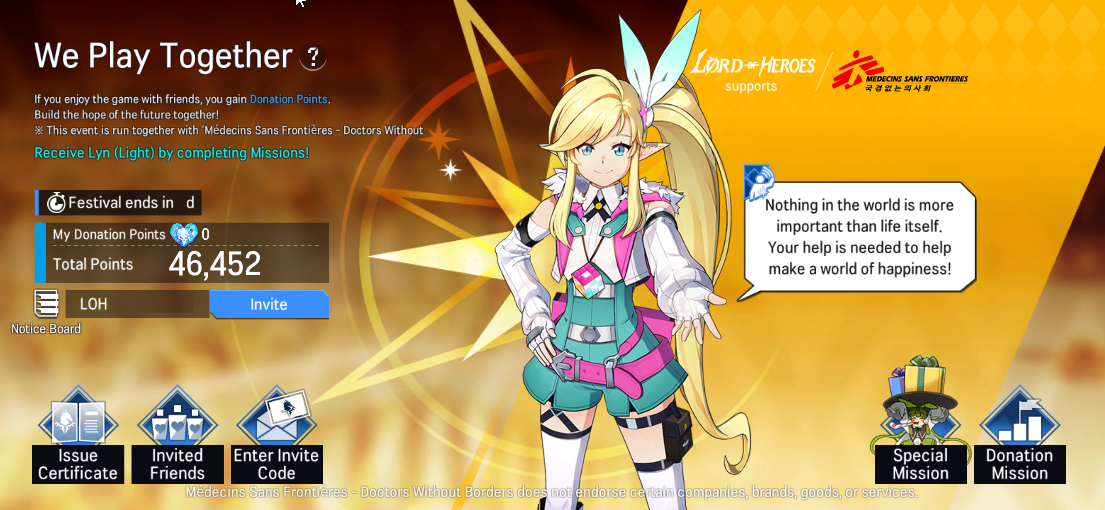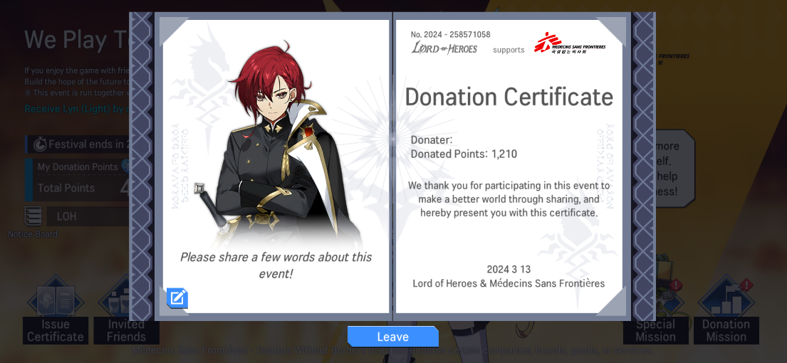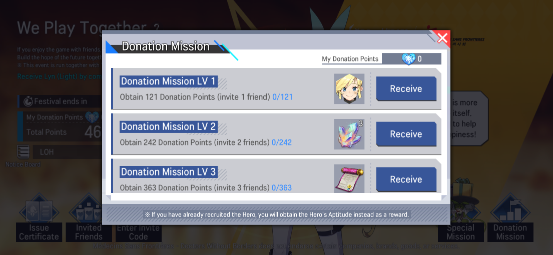 - You can obtain a '[Invite a Friend] Friendly Knight's Pledge' when you reach a specific threshold of Donation Points. You can use the item to recruit one of the following heroes: Lyn (Light) / Lairei (Water) / Johan (Water)