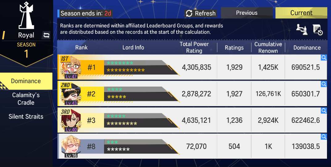 ※ After the Leaderboard Calculation is completed, rewards are distributed based on the rankings within your affiliated Leaderboard Group from the previous season. Leaderboard Rewards are distributed from the Leaderboard screen after the calculation, and the rewards will be sent to your Mailbox. Leaderboard Rewards are stored in the Mailbox for 7 days from the time of claiming.