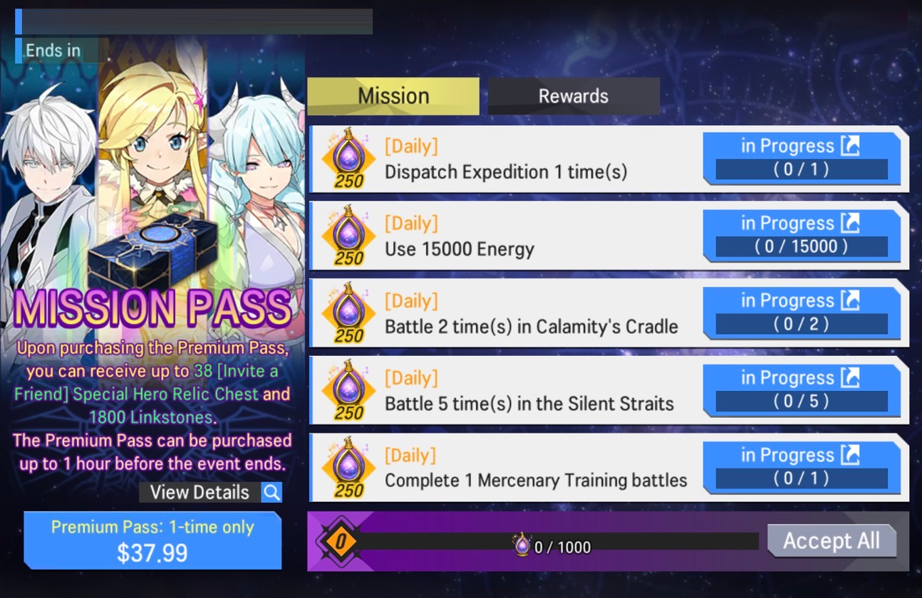 - Price: USD 37.99 (Once per account)- Complete missions in the Premium Pass and earn rewards such as Linkstones and Hero Relic Chests!