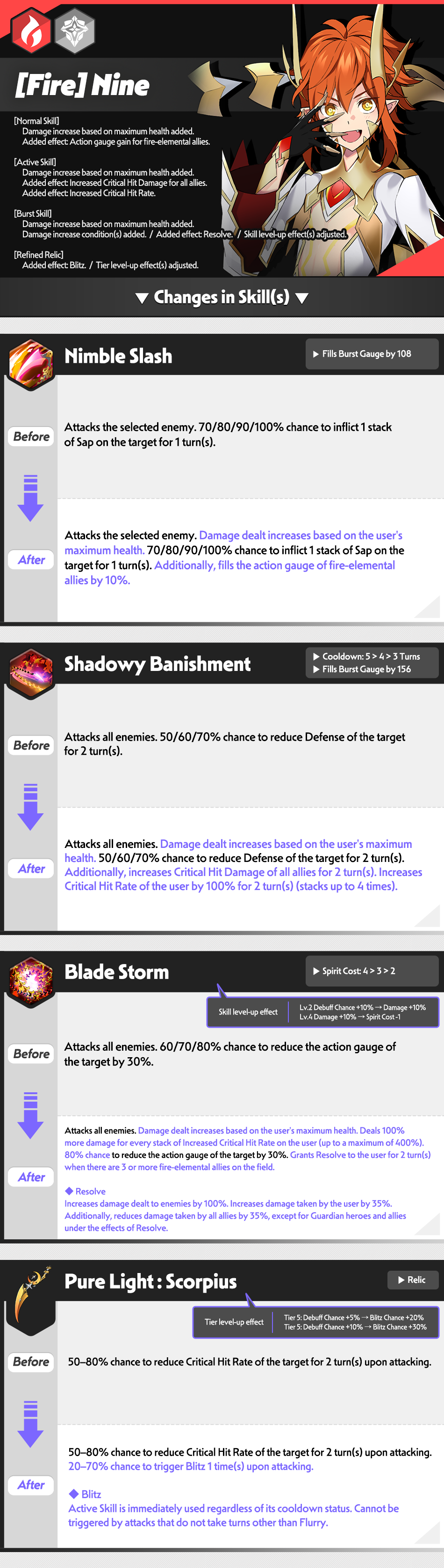 1. The following heroes will undergo balance adjustments: Nine (Fire), Dhurahan (Light)