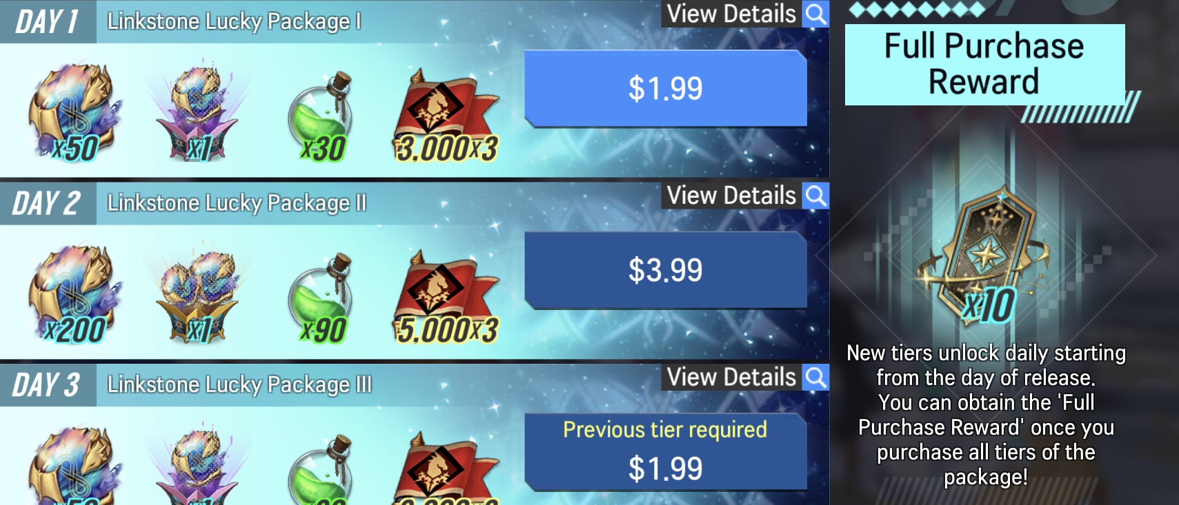 ※ You will receive 10 Link Summon Tickets once you purchase all tiers of the package.