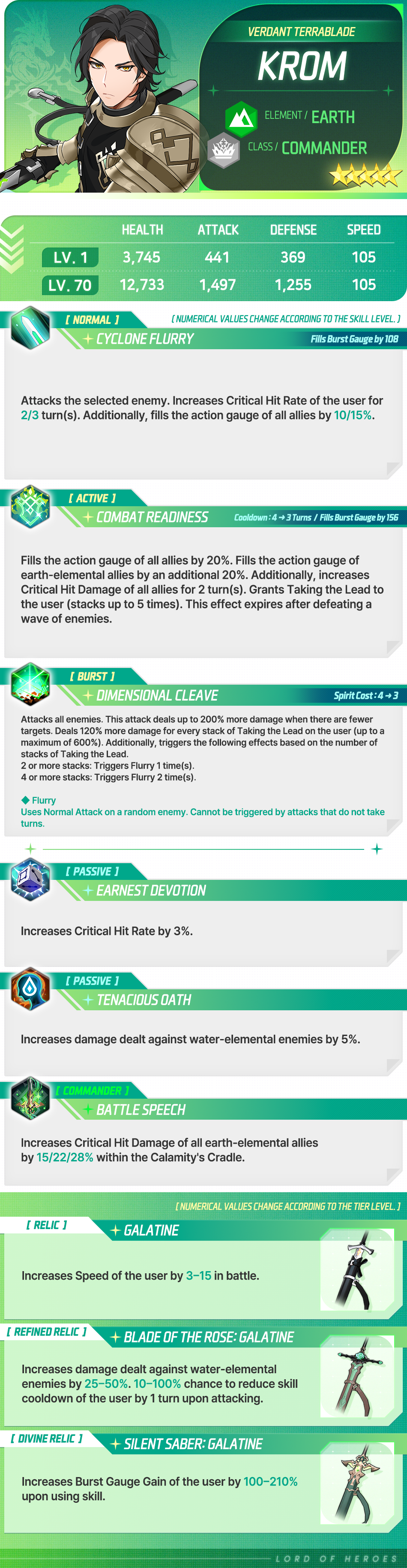 And so, everyone who knows him believes that he deserves the titles that follow. He is the 'Flower of the Banquet Hall' possessing a discerning eye for beauty and art, and the 'Undefeated Knight Captain' who boasts unwavering courage. These titles all express the people’s deep admiration for him, but perhaps 'Spring' is the one that best encapsulates Krom, as he envisions a warm world free of brutal wars and harsh winters.