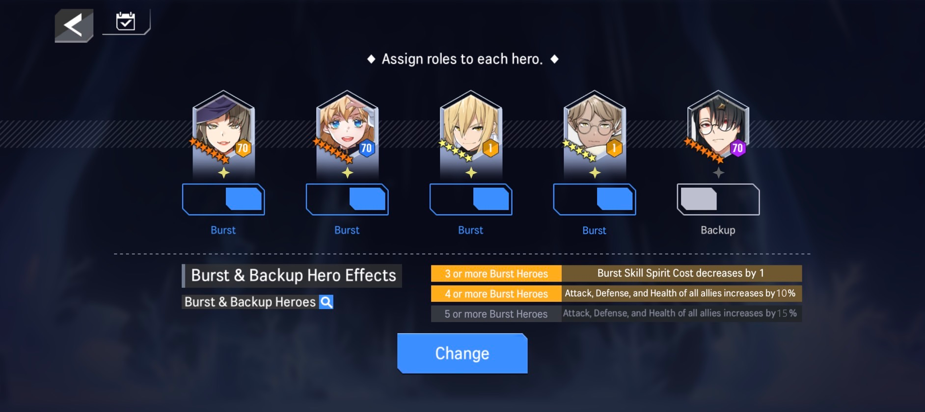 - The minimum number of heroes that must be assigned to Burst is 2, and the maximum number of heroes that can be assigned to Burst is 5. Players can change the roles of heroes using the toggle button displayed on the battle formation menu.