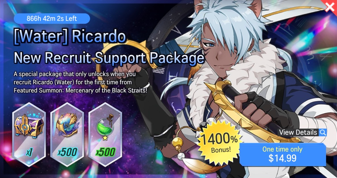 ※ A special package that unlocks only when you recruit Ricardo (Water) for the first time from Featured Summon: Mercenary of the Black Straits.