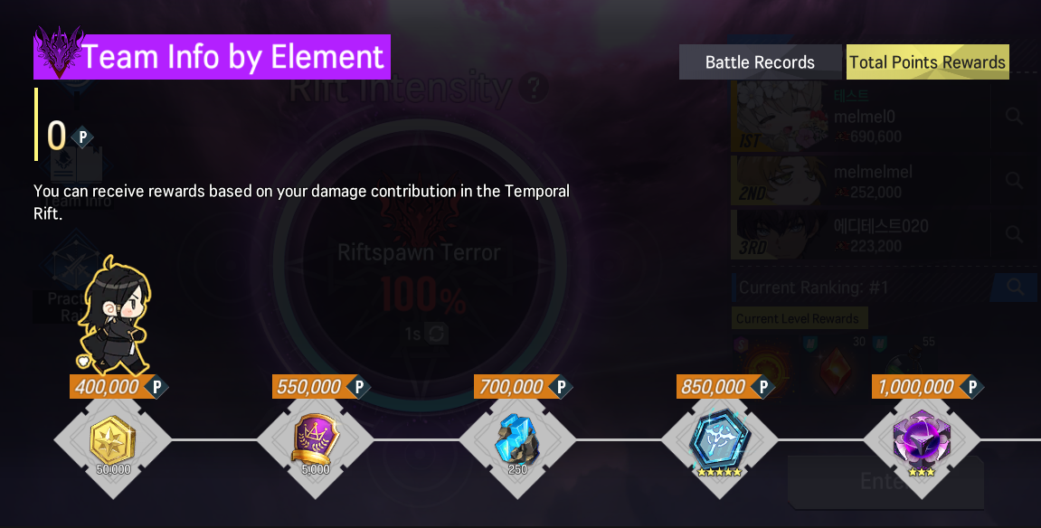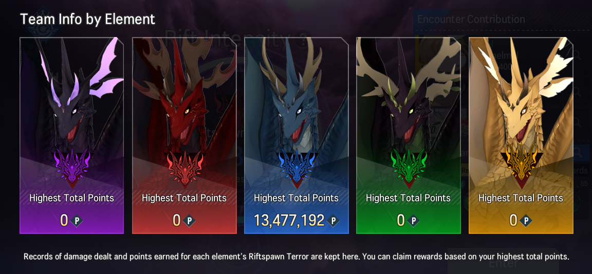 - The Team Info by Element screen can be accessed by tapping the Team Info button in the Temporal Rift. - Players can view battle records by element and claim any available rewards on this screen. - The Battle Records tab allows players to view detailed battle records by the Riftspawn Terror's element. - Only the records of the last 50 battles in the Temporal Rift will be displayed.