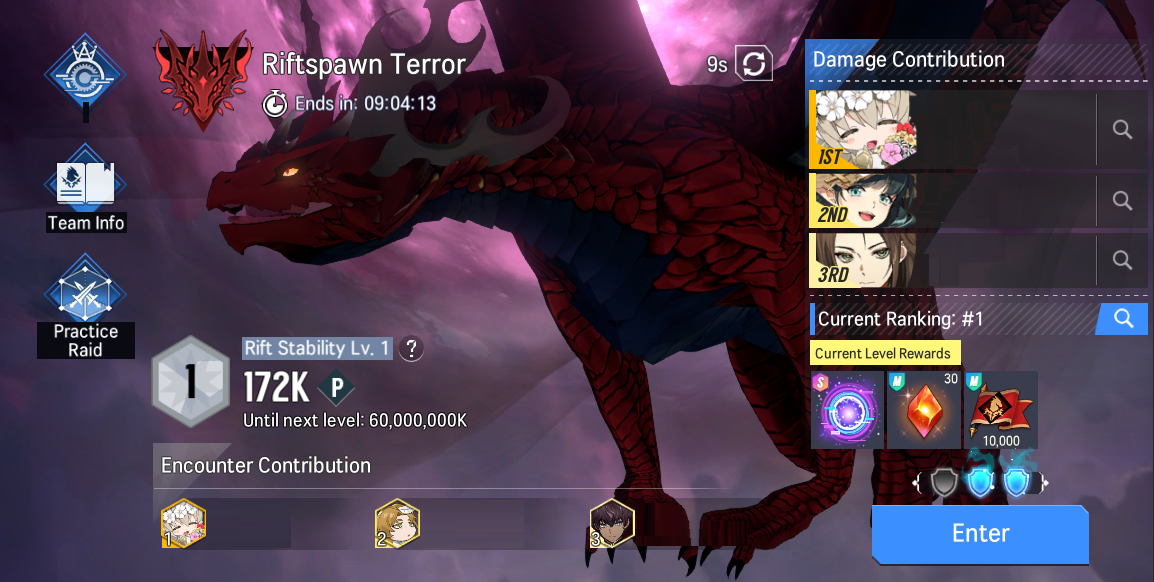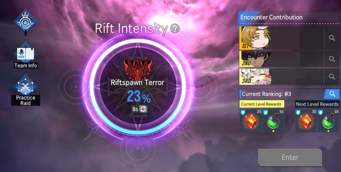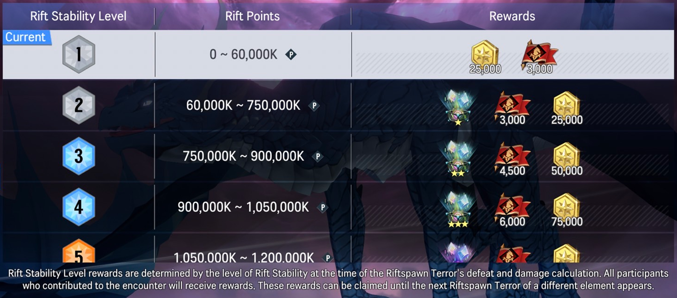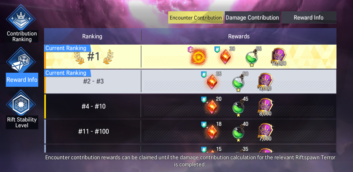 - Damage dealt in battles against the Riftspawn Terror is converted to Rift Points. - Rewards are distributed to players based on the rank of the points they earn. - Rewards for each rank can be found in the Reward Info tab via Rift Contribution > Reward Info.