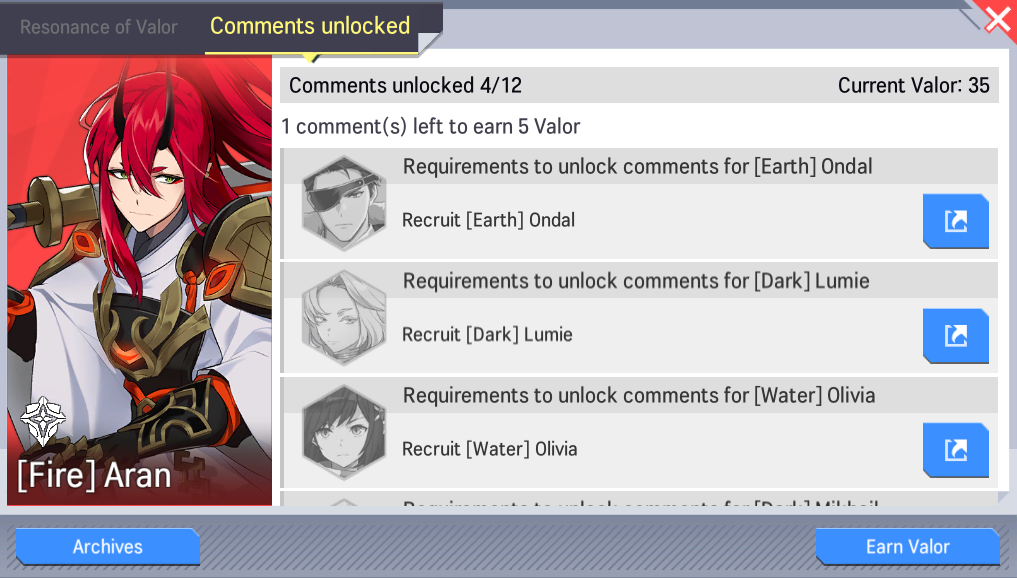 - Players can view the Vanguard's current Valor and comment unlock status through the Comments Unlocked tab. - Valor can be earned by unlocking the hero's comments.