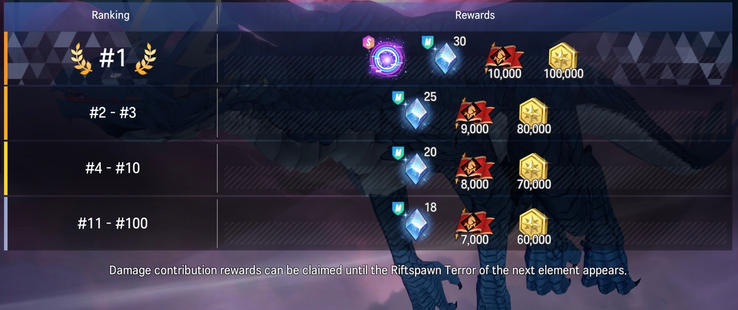 - Players can receive rewards based on their Damage Contribution to the Riftspawn Terror by element. - Rewards will be sent to the Mailbox.