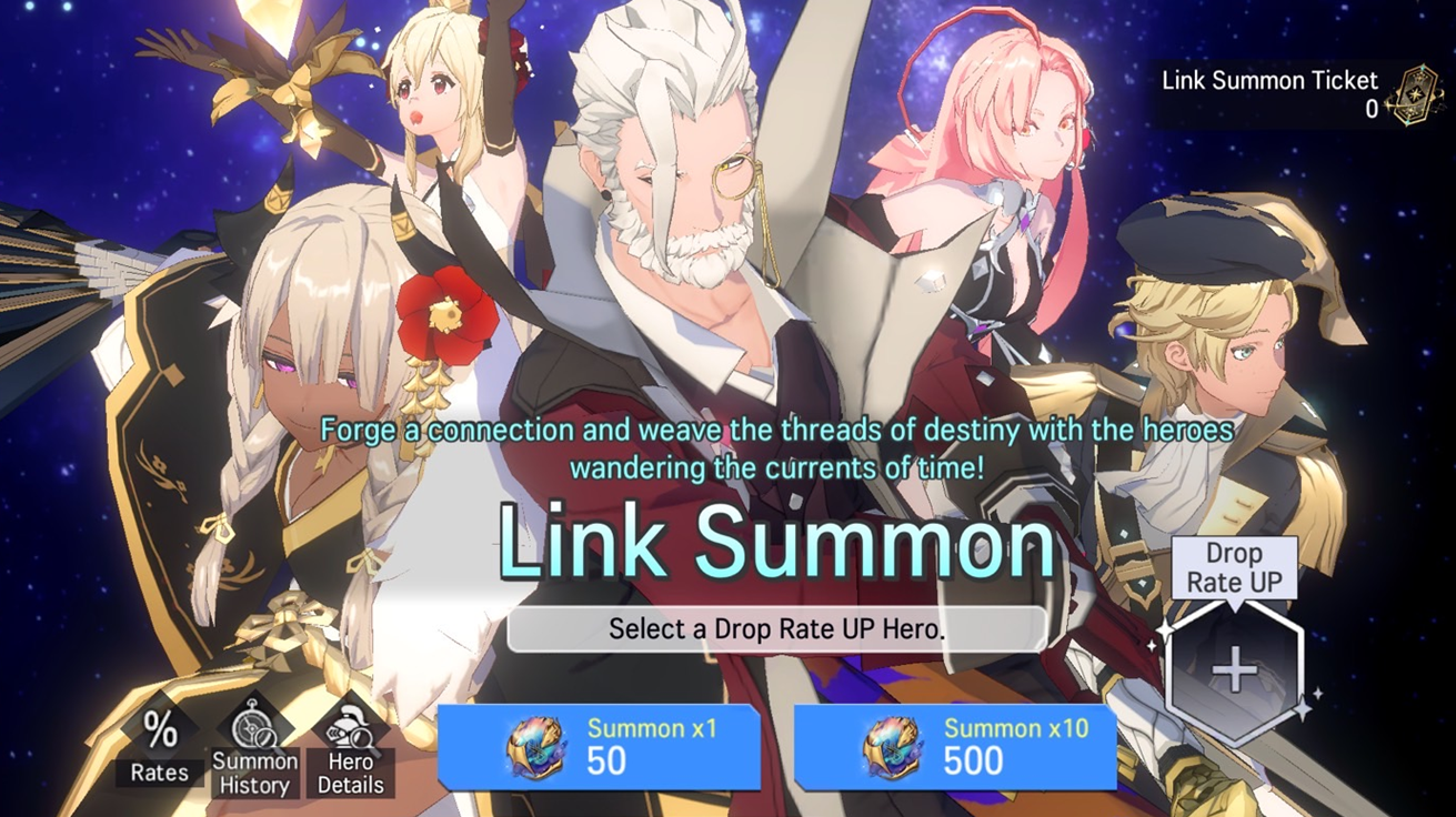 [Important Notes] ※ Featured Summon consists of the following summon rates: Featured Summon Hero (1%) / Other Heroes (1%) / Divine Relic (25.0000%) / Refined Relic (25.0000%) / Relic (48.0000%) ※ All Featured Summons share the same summon count. This summon count does not overlap or count towards other types of summons. ※ Any Relics & Heroes that are summonable from Featured Summon may be summonable from other summons in the future. ※ If the player has not recruited the featured 5★ Hero within 89 summons, then the player is guaranteed to recruit featured 5★ Hero on the series of summons that includes their 90th. ※ If the player recruits the guaranteed recruit hero before their 90th summon, the summon count will be reset. ※ If the player has 'Featured Summon Tickets', the tickets will be used first before other items. However, if the number of tickets possessed is insufficient to perform all desired summons, the player can use Linkstones to complete the summoning process. ※ Detailed information on summon rates for obtainable Heroes and Relics are available via the Rates button.