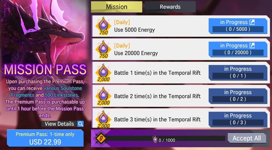 ※ The package is effective immediately upon purchase and thus not refundable. ※ Purchased pass rewards can be claimed by clicking on the Receive button. Rewards will be sent to your Mailbox. ※ Please note that expired items cannot be restored. ※ Players can meld 100 Soulstone Fragments with 150,000 Gold to create a Soulstone in the Inventory.