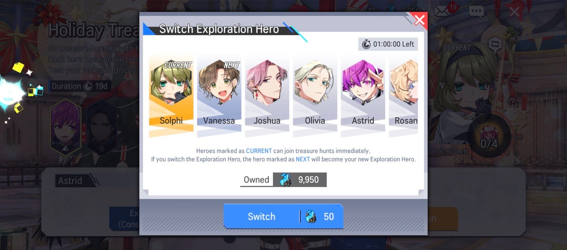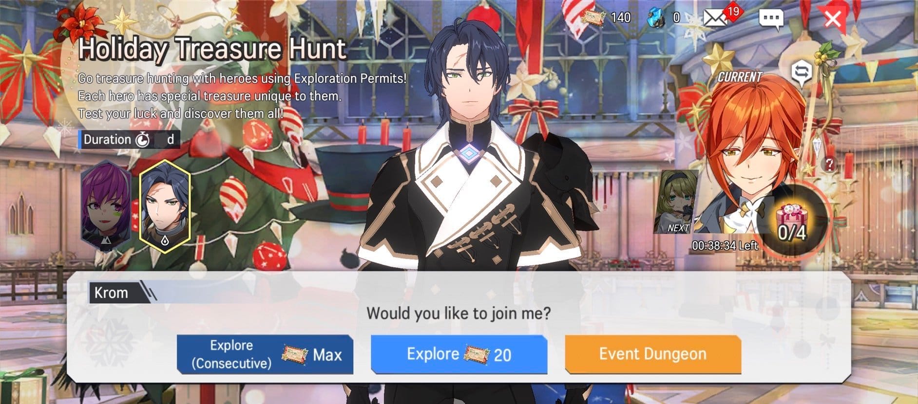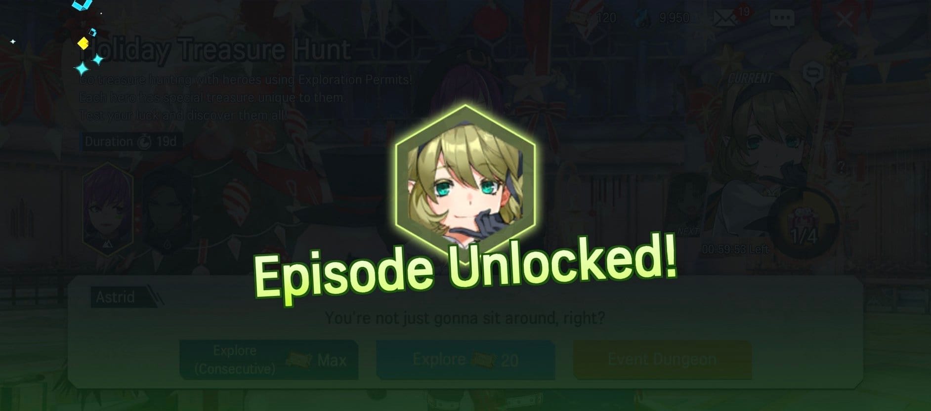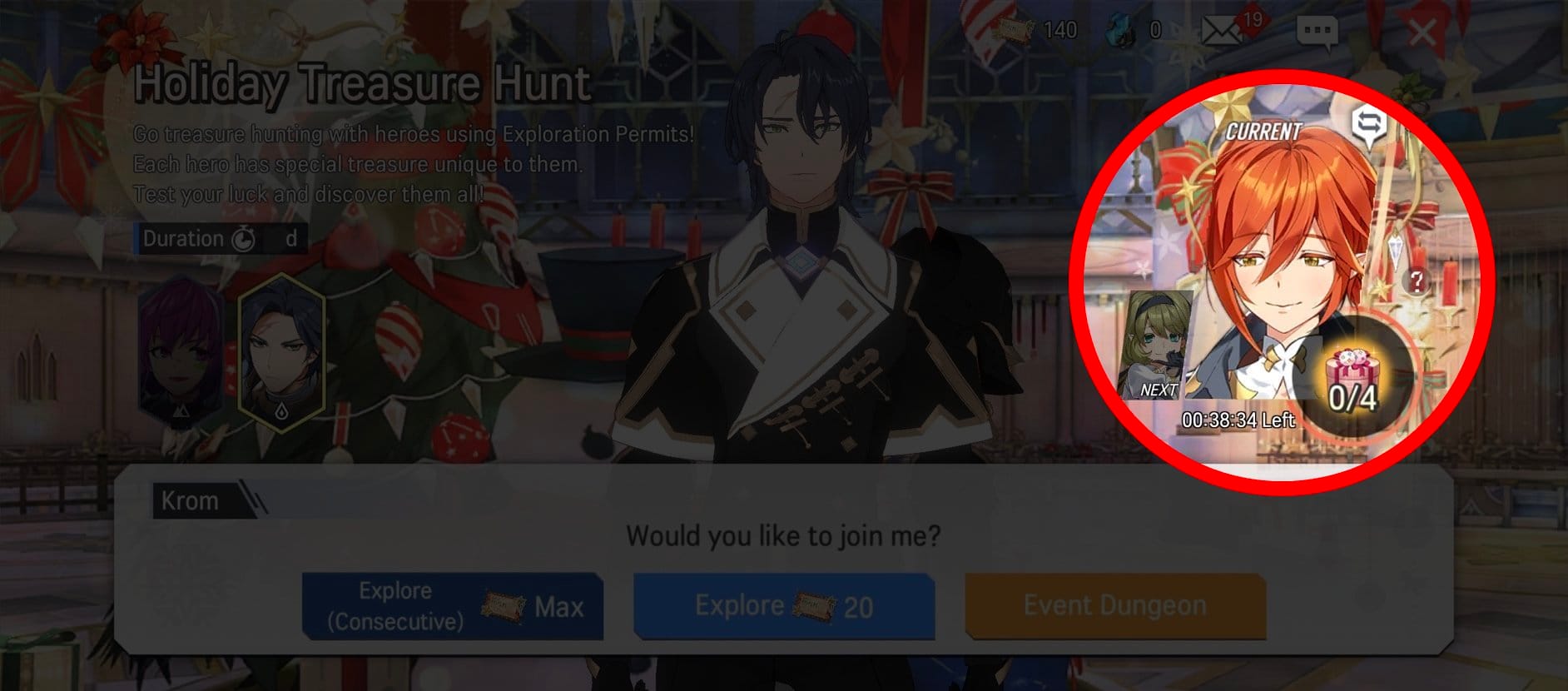 - When players click the Explore button in the Holiday Treasure Hunt Event, they will go on a treasure hunt with the current main hero (Krom or Astrid) and a partner hero they can explore with. Players will be able to encounter Episodes featuring the partner hero and obtain rewards through this feature.