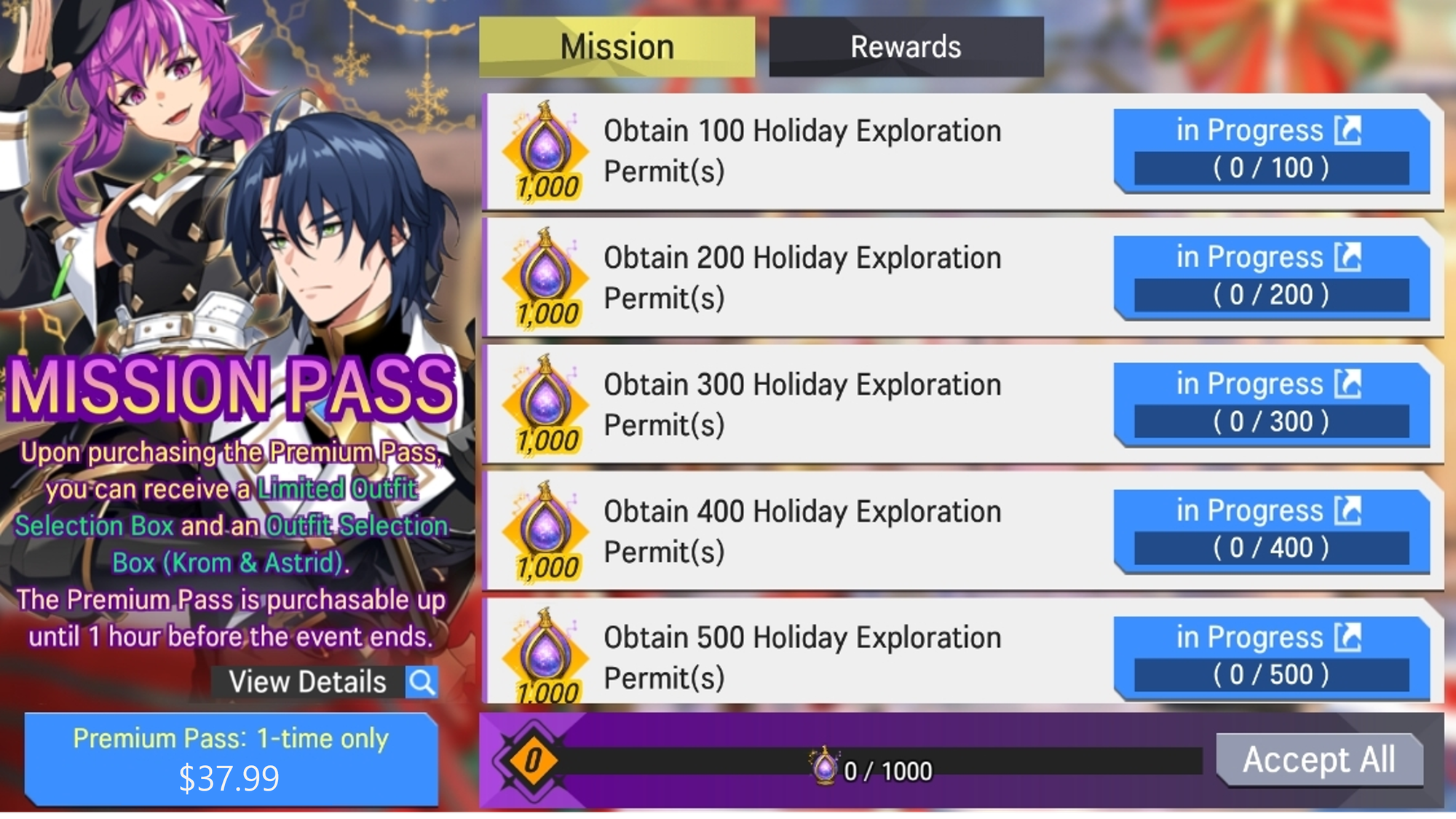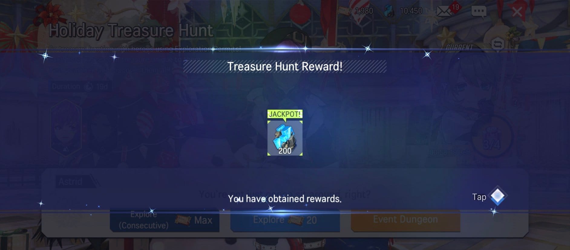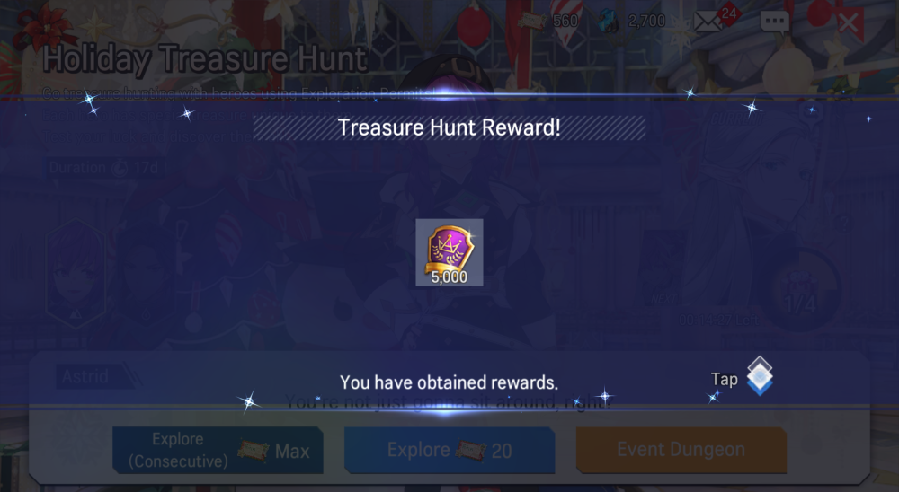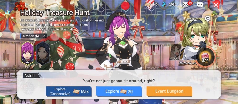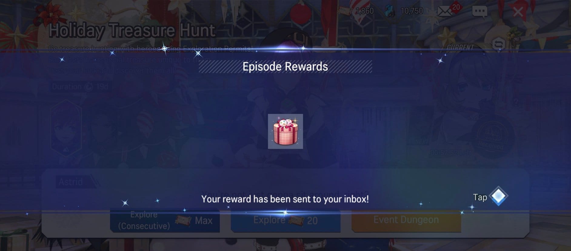 - When players click the Explore button in the Holiday Treasure Hunt Event, they will go on a treasure hunt with the current main hero (Krom or Astrid) and a partner hero they can explore with. Players will be able to encounter Episodes featuring the partner hero and obtain rewards through this feature.
