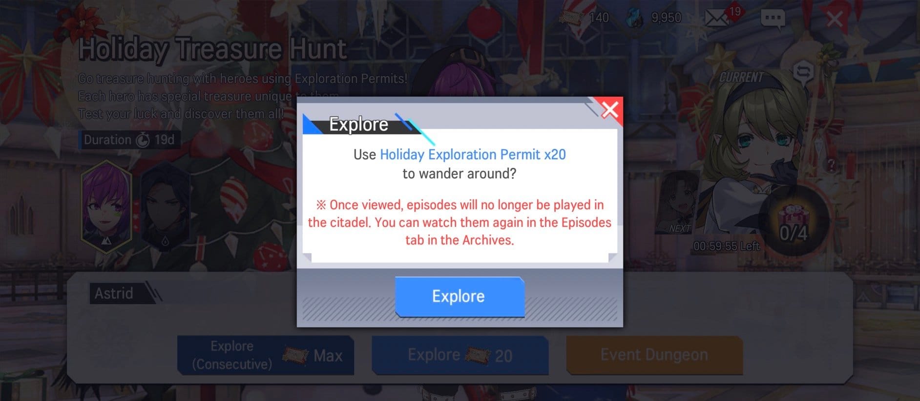 - Players can use Holiday Exploration Permits by tapping the Explore button, allowing players to begin treasure hunting with a designated hero.