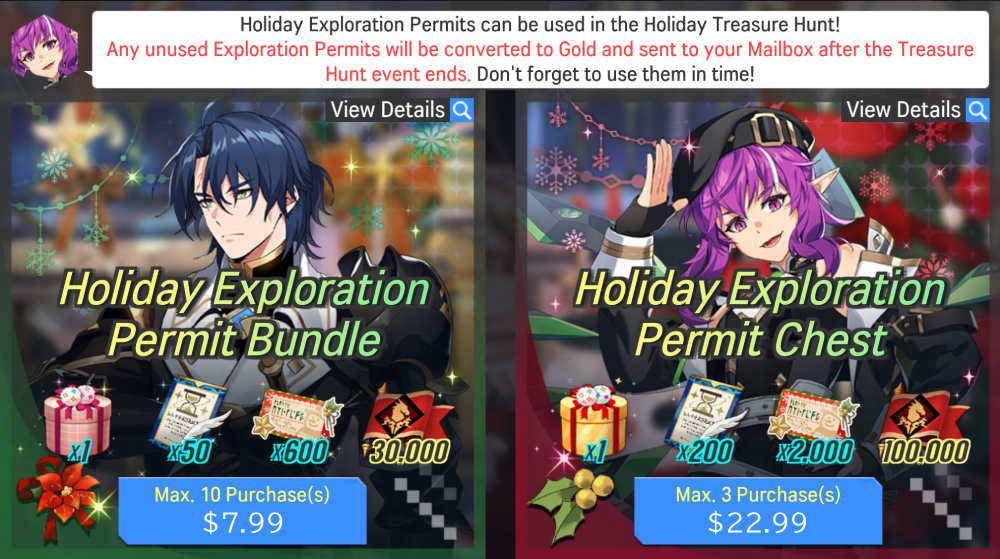 ※ Holiday Exploration Permits are usable in the Holiday Treasure Hunt Event. Remaining Holiday Exploration Permits are automatically converted to Gold and sent to your Mailbox when the event ends.