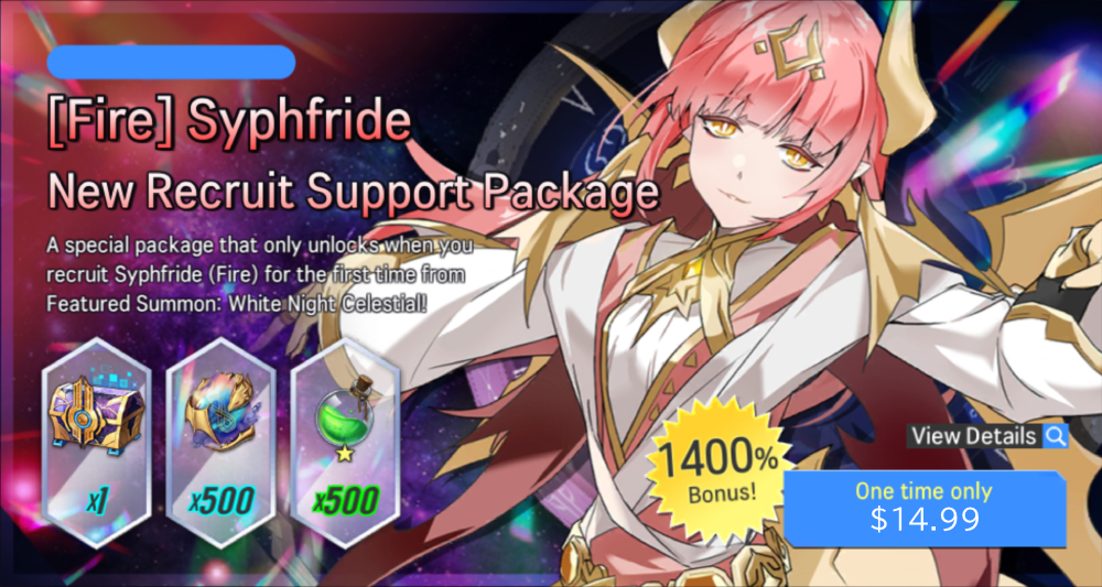 ※ A special package that unlocks only when you recruit Syphfride (Fire) for the first time from Featured Summon: White Night Celestial.