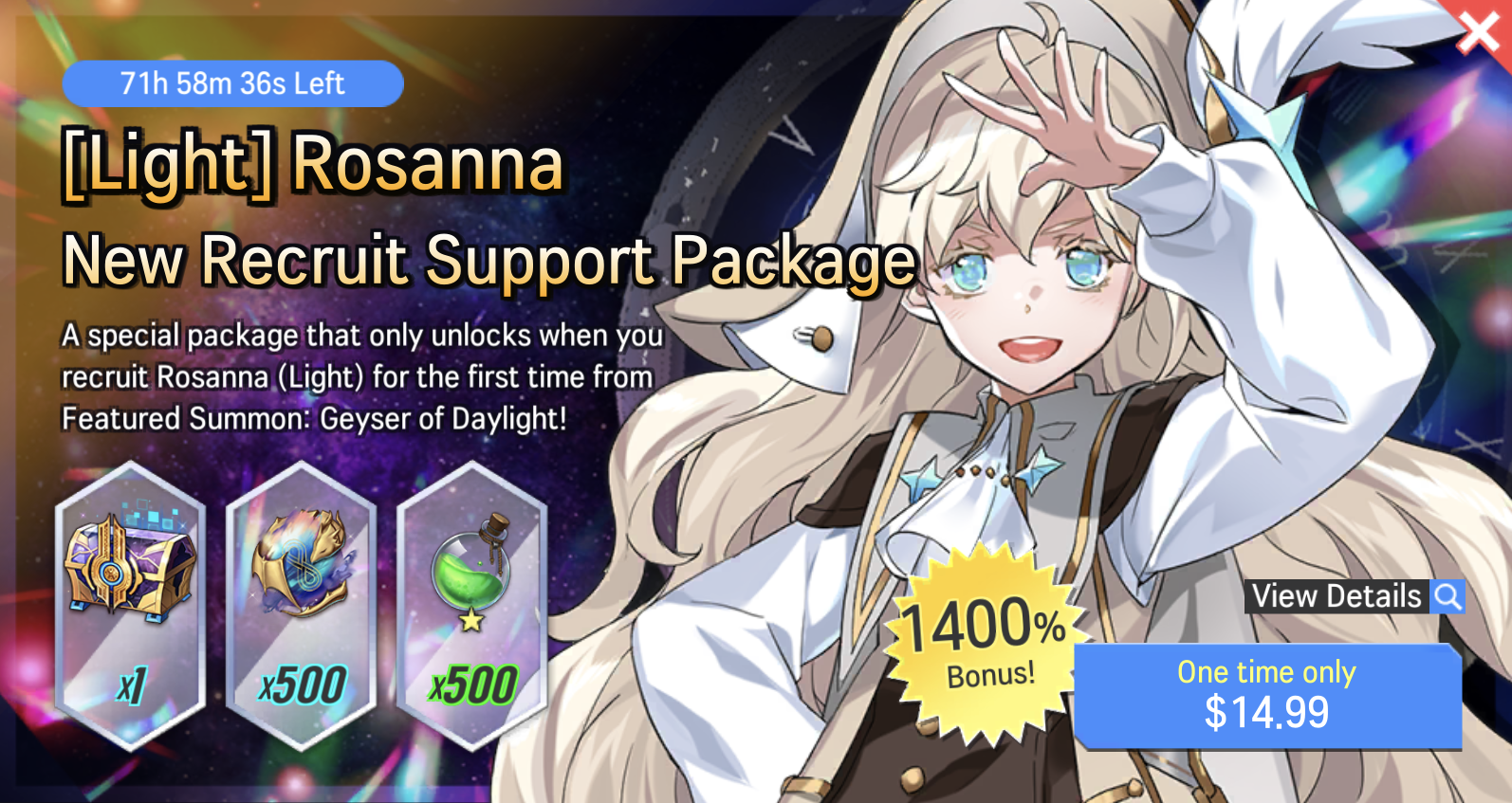 ※ A special package that unlocks only when you recruit Rosanna (Light) from Featured Summon: Geyser of Daylight.