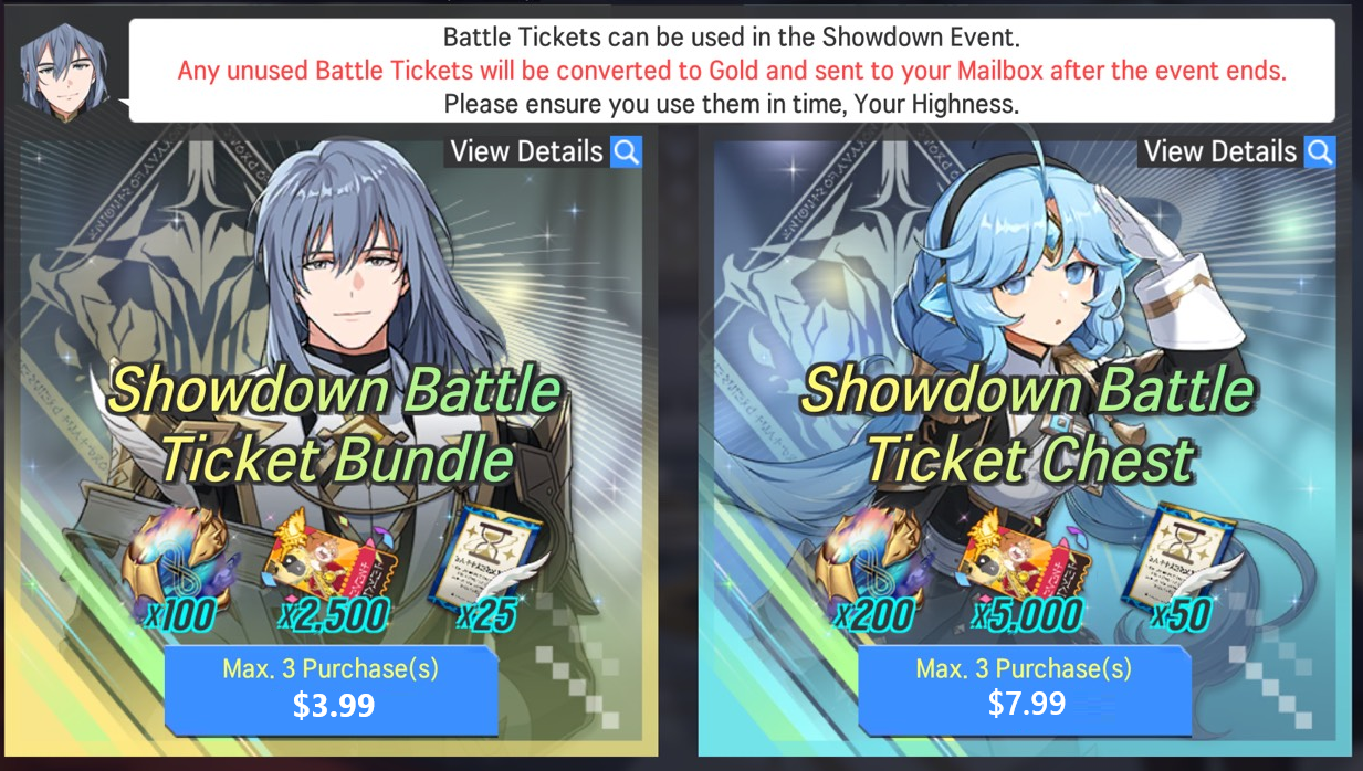 ※ Battle Tickets are usable in the Showdown! Knights of Avillon event. Remaining Battle Tickets are automatically converted to Gold and sent to your Mailbox when the event ends.