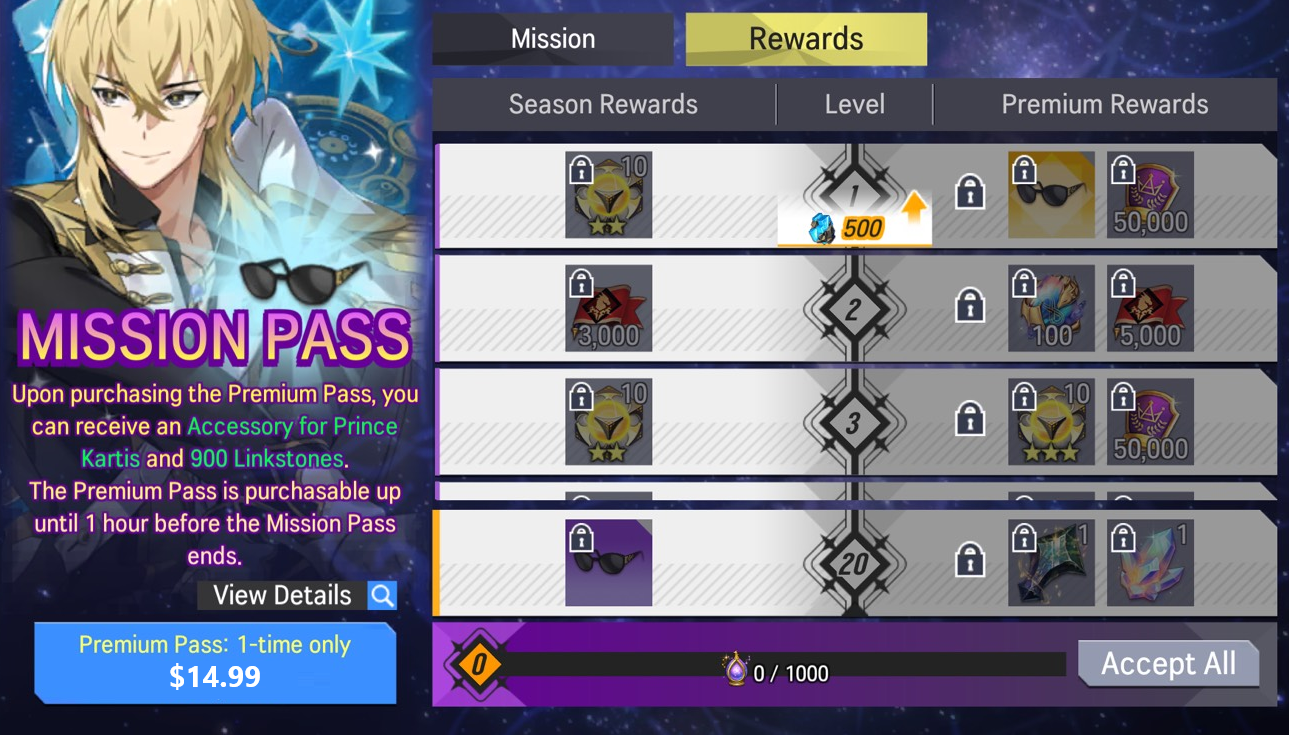 - Complete missions in the Prince Kartis Mission Pass and earn various rewards such as Accessories for Prince Kartis and Linkstones!