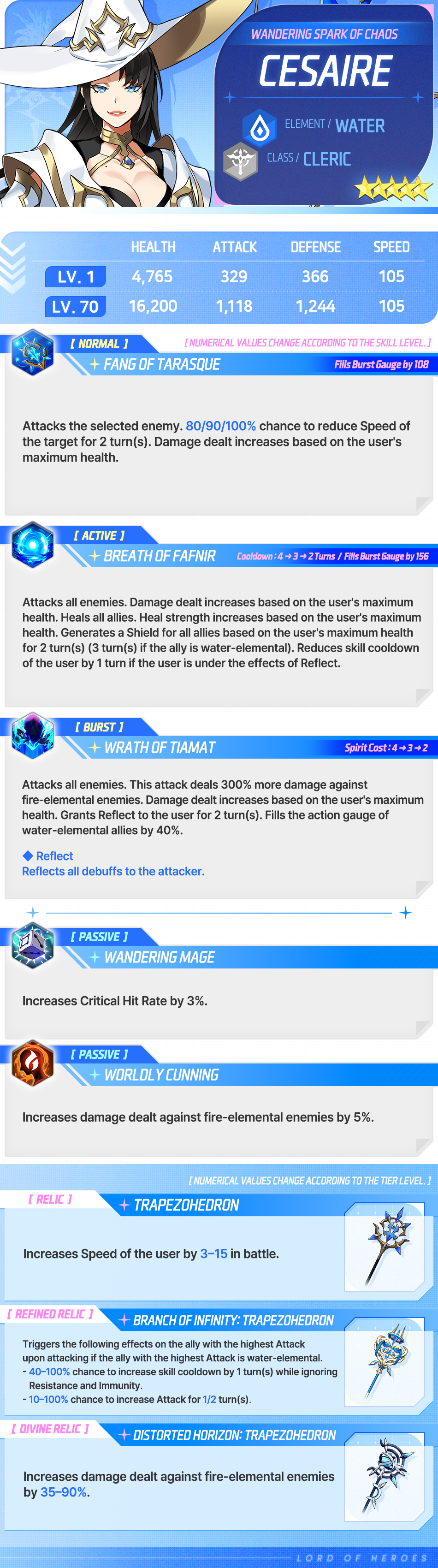 Years passed, and Cesaire came to visit you—looking exactly the same. No one knows how she, a mortal like any other, seemed to defied time. Some whisper of a pact with an abyssal deity, others of a stolen ancient dragon's breath. Perhaps one is true. Perhaps both. Or maybe just rumors.
