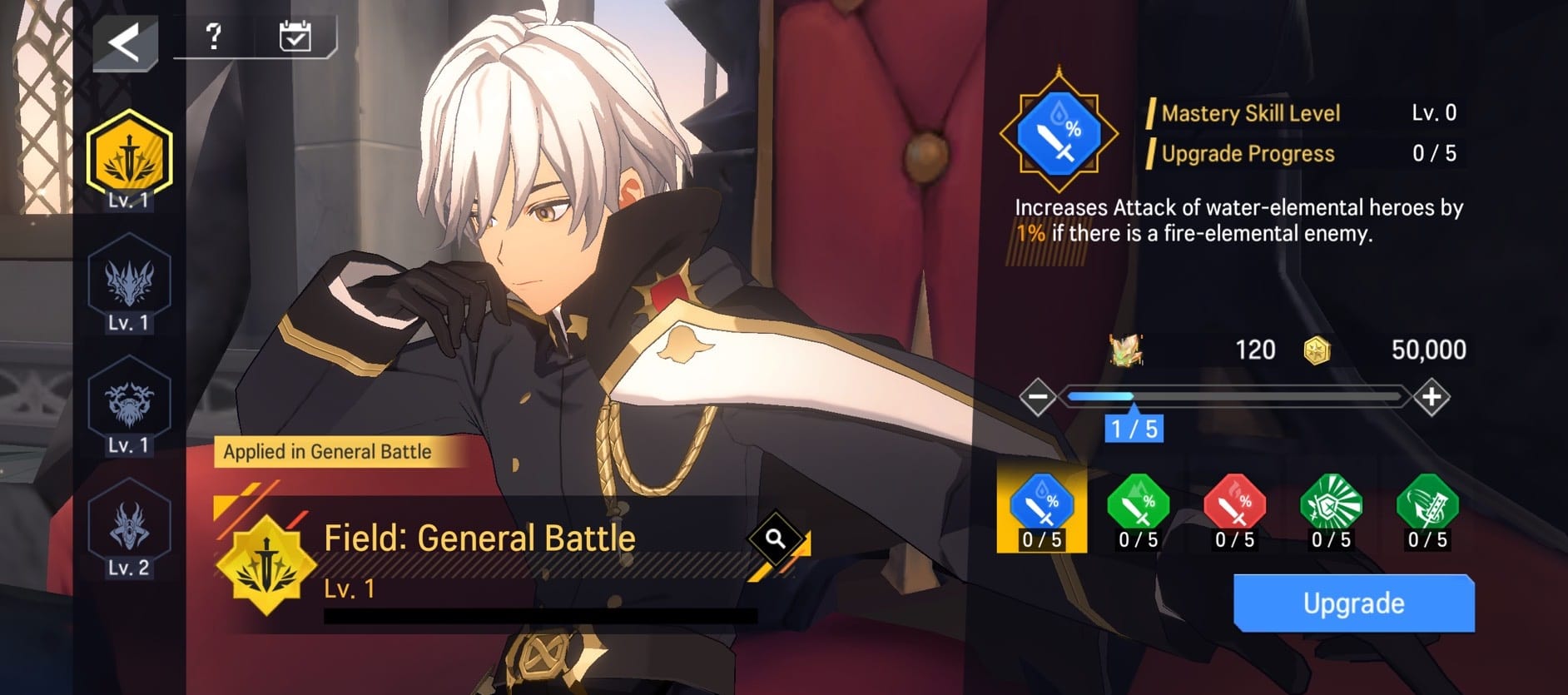 - You can upgrade your Mastery Skills for better effects in various Fields such as General Battle, Calamity's Cradle, Silent Straits, and Temporal Rift.