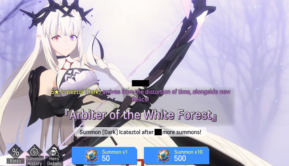 ※ Detailed information on summon rates for obtainable Heroes and Relics are available via the Rates button.
