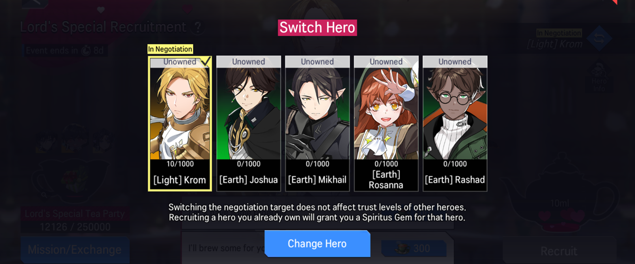 ※ Event heroes: Krom (Light), Joshua (Earth), Mikhail (Earth), Rosanna (Earth), Rashad (Earth)