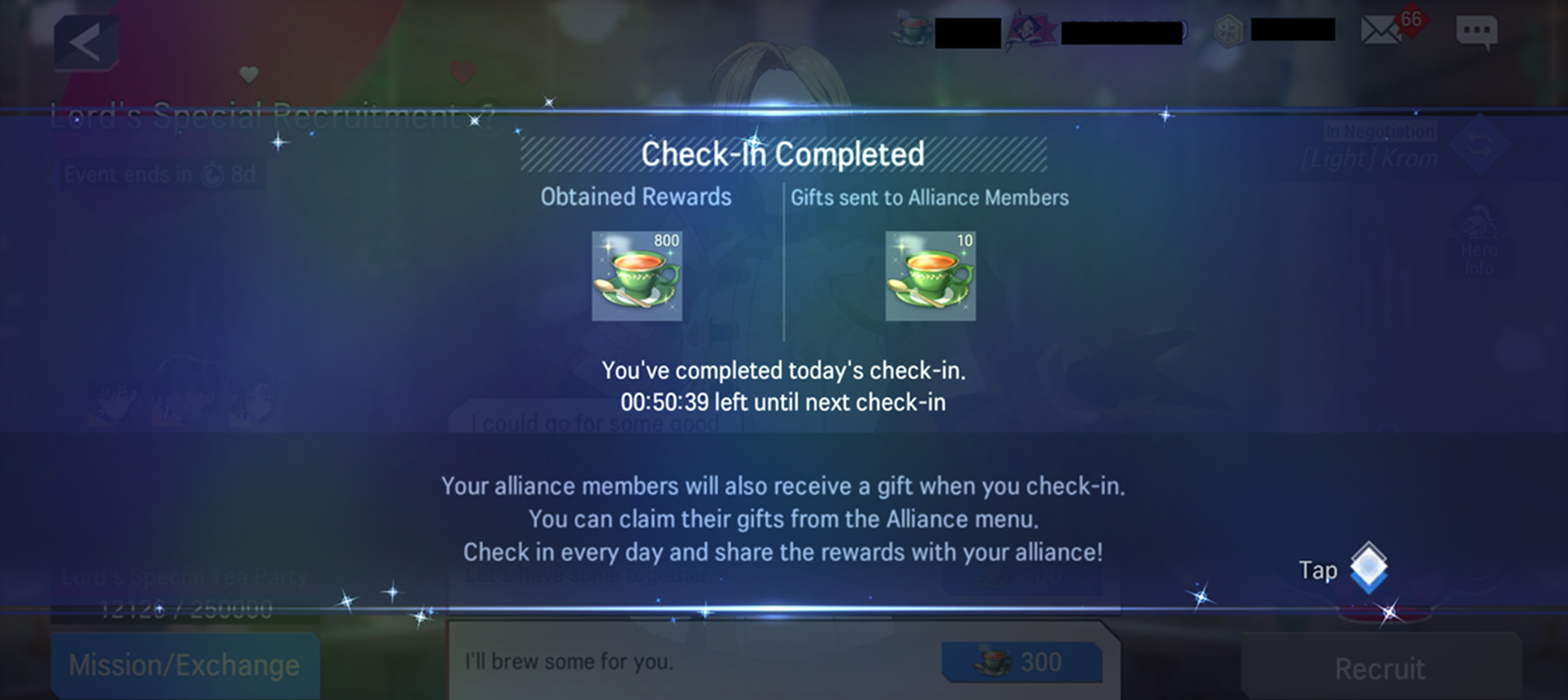 - Enter the Lord's Special Recruitment event screen every day to Check-In and obtain 'Warm Cup of Tea'. Alliance members can also receive a certain amount of 'Warm Cup of Tea' as a present.
