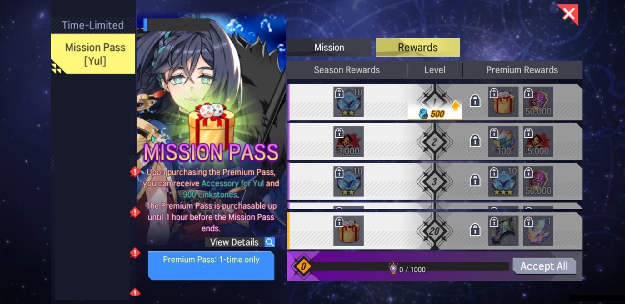 - Various rewards such as accessories are obtainable by completing missions from the Mission Pass.