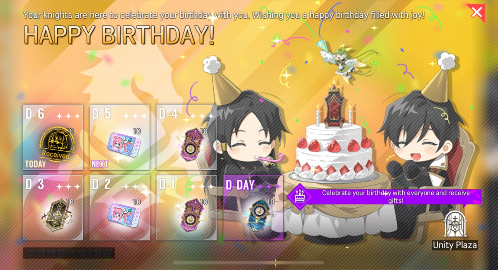 - Once your Birthday Check-In becomes available, you can celebrate your birthday with other players at Unity Plaza.