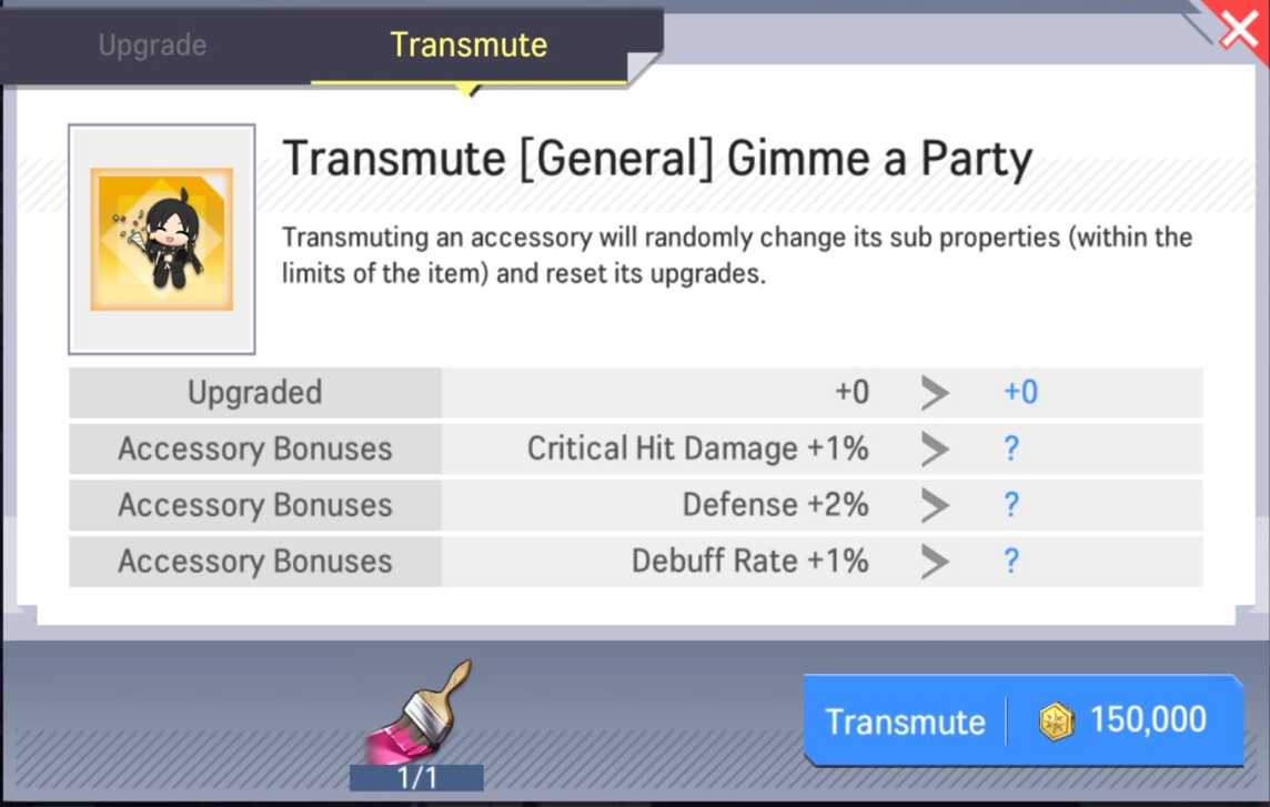 - Transmuting accessories requires Upcycling Brushes.