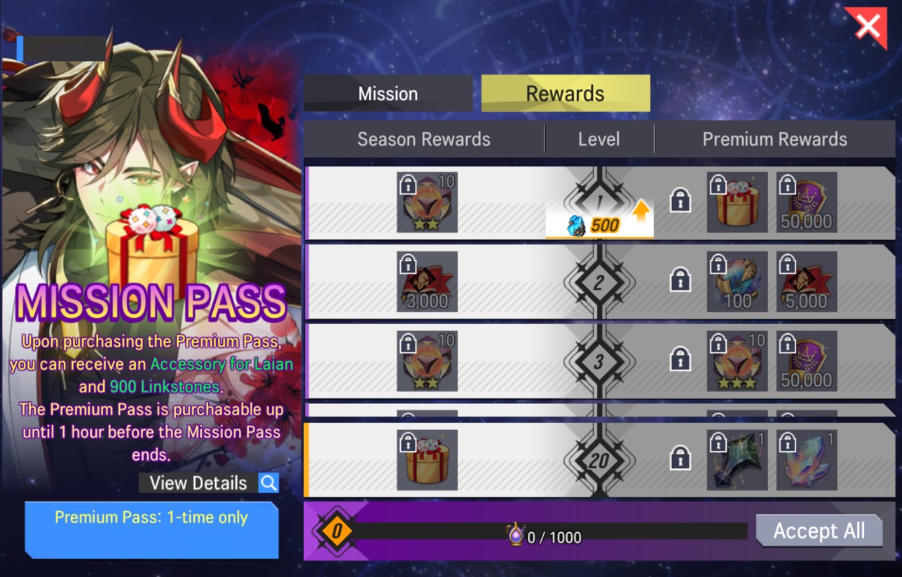 - Various rewards such as accessories are obtainable by completing missions from the Mission Pass.