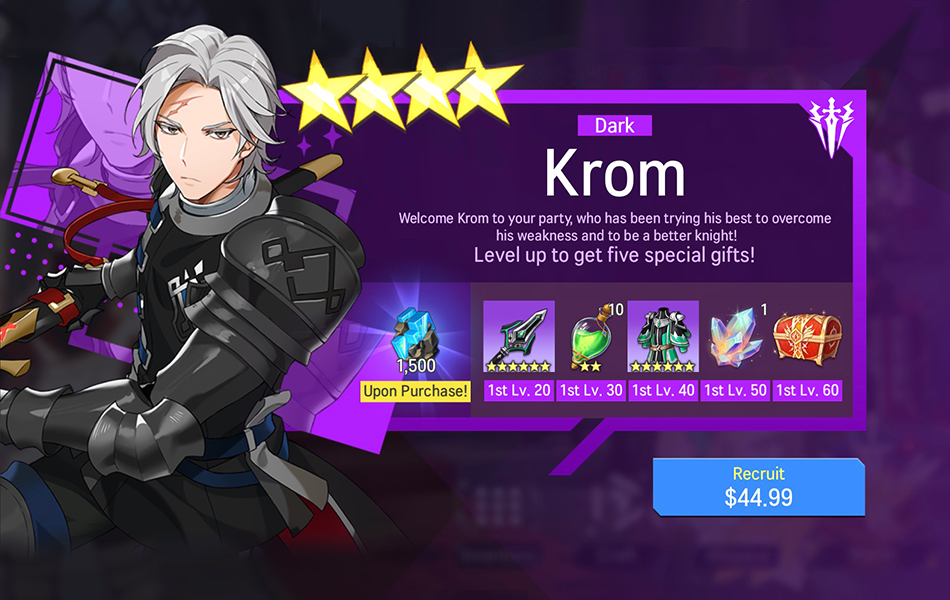 - Krom (Dark) can be recruited by purchasing a Hero Special Package.